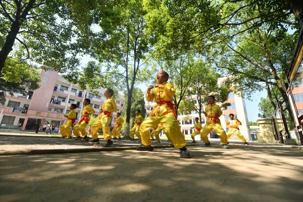 2025年5月13日,學生在蒙山縣文圩鎮文圩中心小學練習武術操。