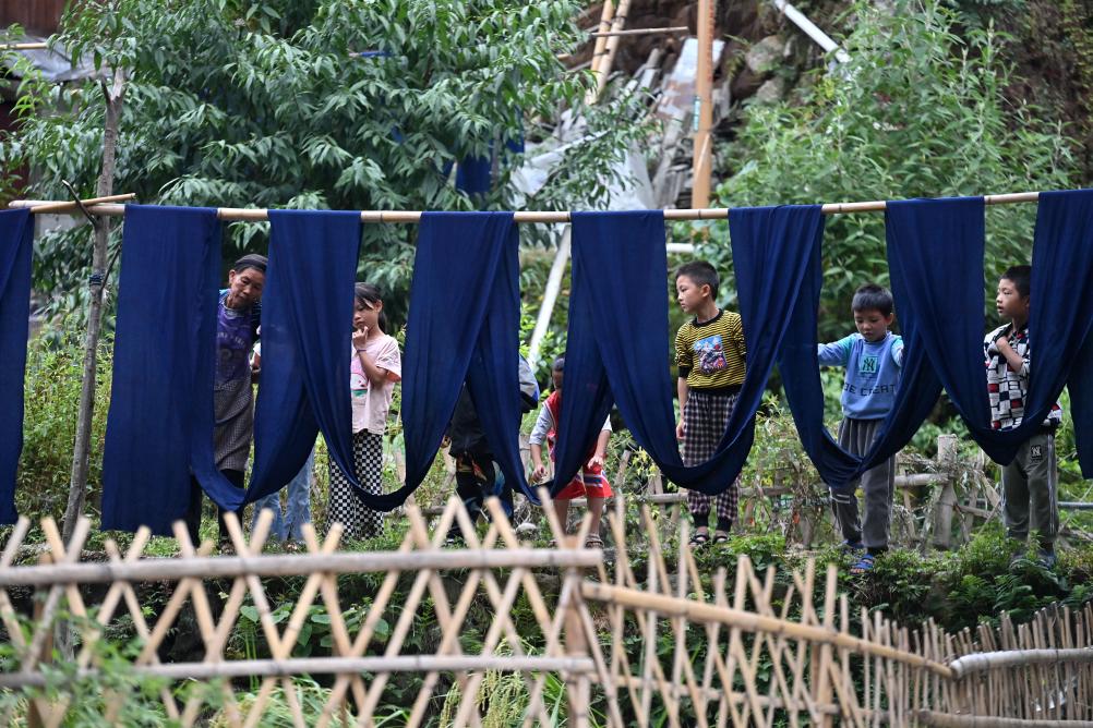 烏英苗寨的孩子們觀看老人制作亮布(2022年9月7日攝)。
