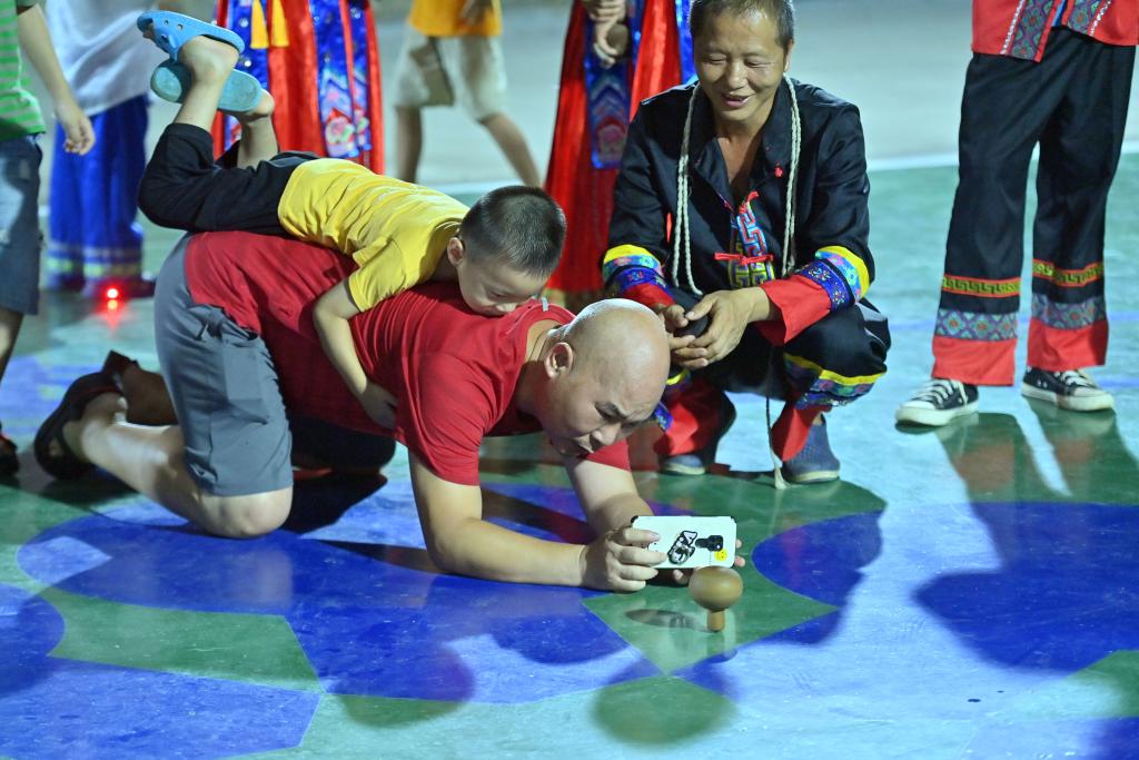 在瑤山的仁良村,4歲的黃弘程,趴在爸爸的身上,感受陀螺運動的樂趣;場邊,一排小學生排著隊,等候上場比賽。