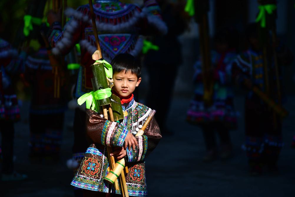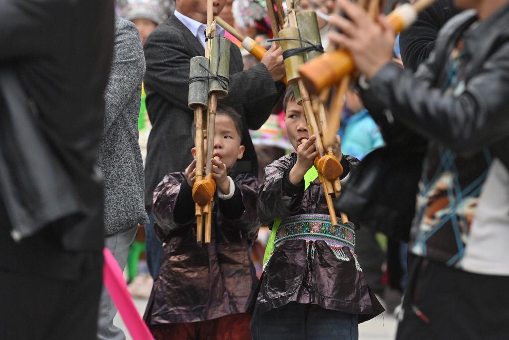 烏英苗寨的小朋友在新春打同年活動中吹蘆笙(2024年2月14日攝)。