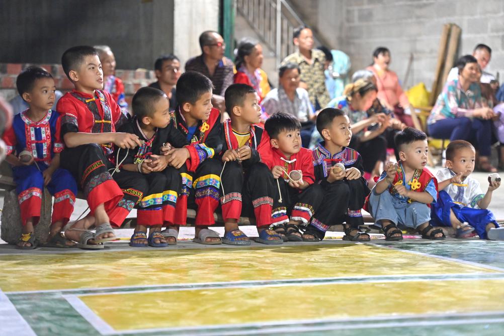 在廣西河池市大化瑤族自治縣大化鎮仁良村,小朋友們在等待參加陀螺比賽(2023年6月4日攝)。