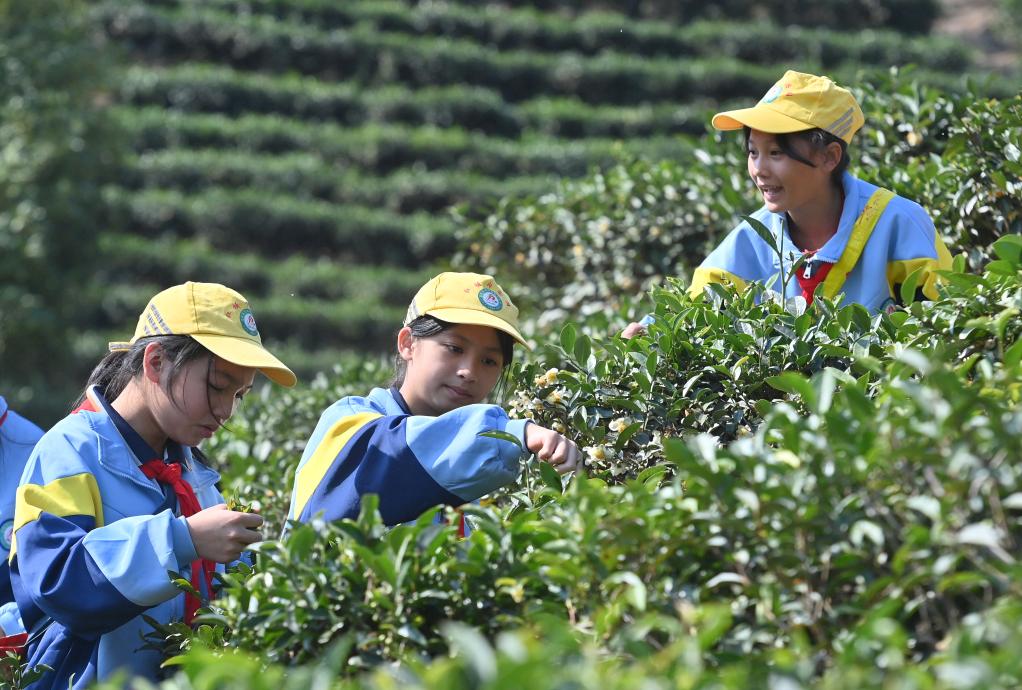 在梧州市蒼梧縣六堡鎮塘平小學“紅領巾茶園”,學生在采茶(2024年12月3日攝)。