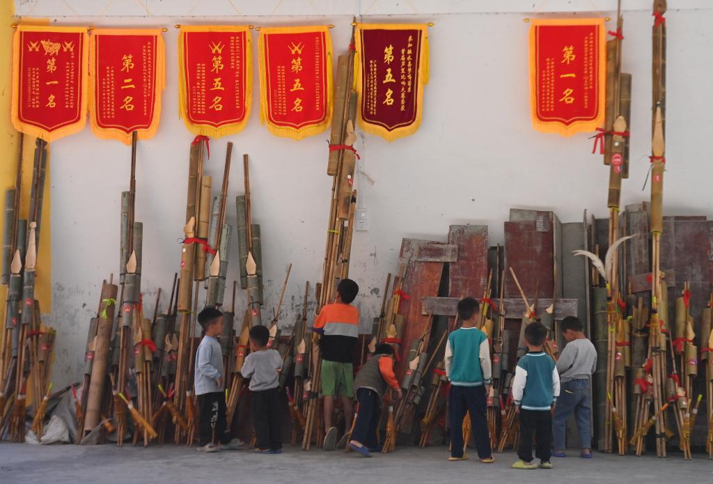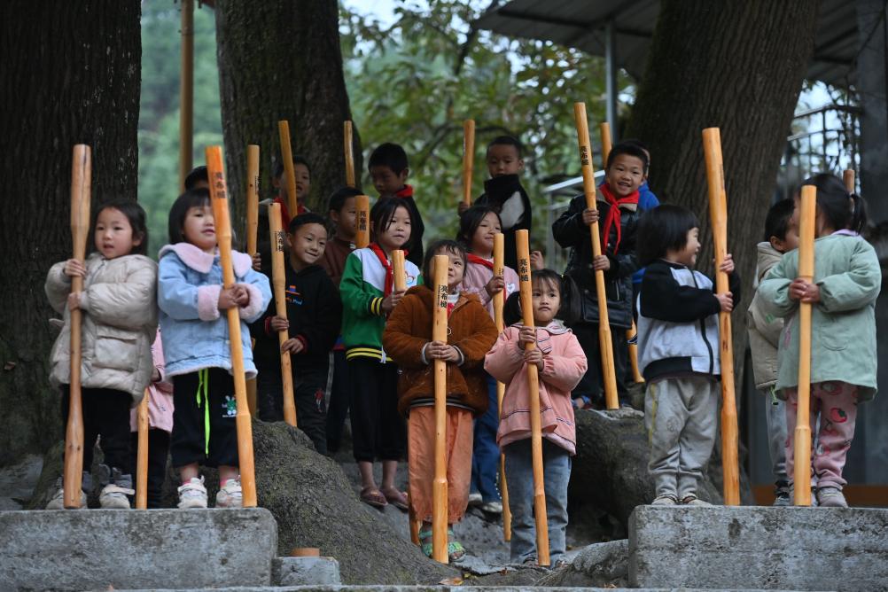 烏英苗寨教學點的孩子們在“亮布文化進校園”課堂上,練習使用亮布槌(2022年11月14日攝)。