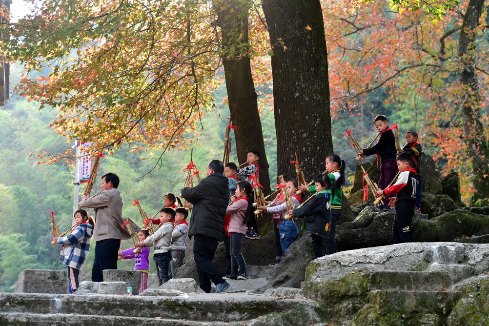 在桂黔烏英苗寨教學點“蘆笙文化進校園”課堂上,師生們在古樹下吹奏蘆笙(2021年12月14日攝)。