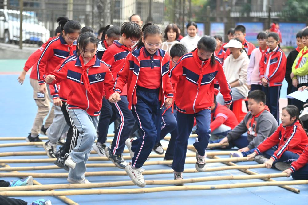 梧州市新興二路小學的學生們在體驗竹竿舞項目(2024年12月6日攝)。