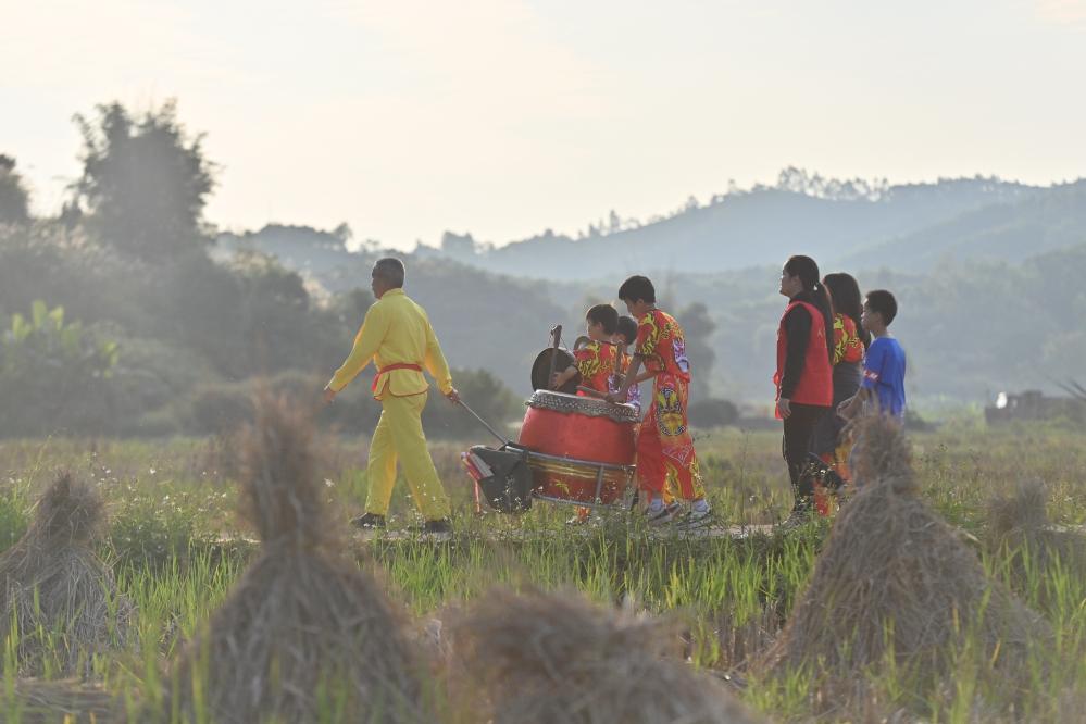 在廣西梧州市藤縣金雞鎮同榮村,龍獅隊的小學生前往村屯進行表演(2023年12月6日攝)。