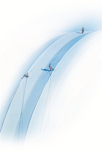 從空中俯瞰,一條藍色的傳送帶將泊位與岸上倉庫串聯起來,像是在海面上留下濃墨重彩的一筆。