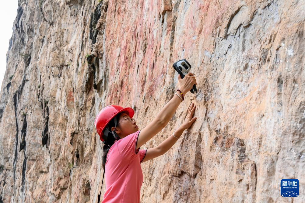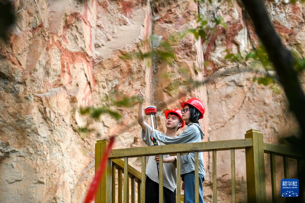 6月19日,在位于廣西寧明縣的一處花山巖畫,工作人員對風化崩落的巖石進行檢測。