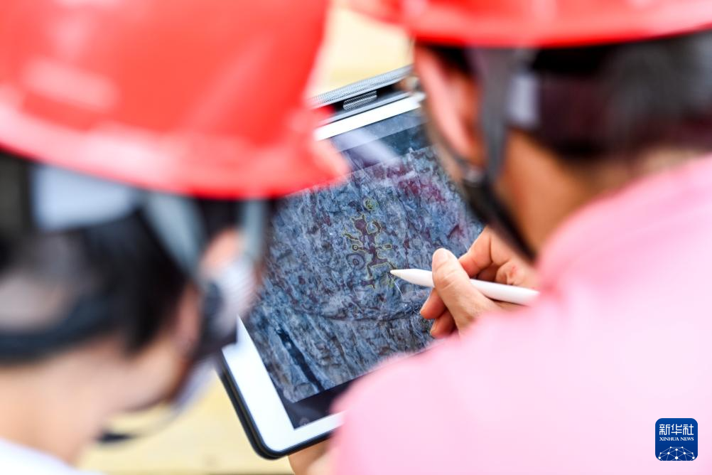 6月19日,在位于廣西寧明縣的一處花山巖畫,工作人員對數字巖畫進行補全。