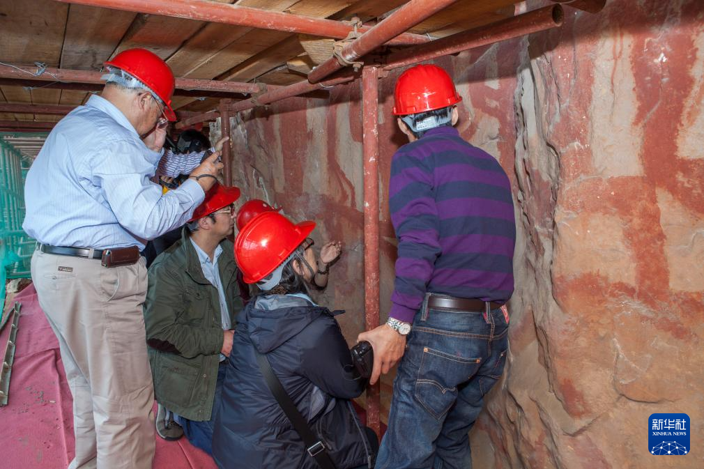 2013年11月19日,在位于廣西寧明縣的一處花山巖畫,技術人員在現場討論修復方案。