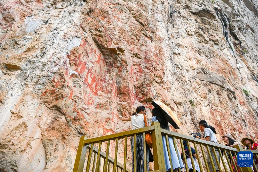 6月18日,游客在位于廣西寧明縣的一處花山巖畫游覽參觀。