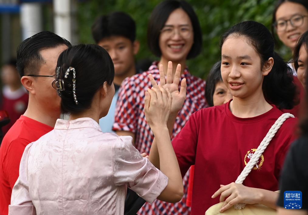 6月24日,在廣西南寧市第十四中學埌東校區,一名考生進入考場前和家長擊掌鼓勁。