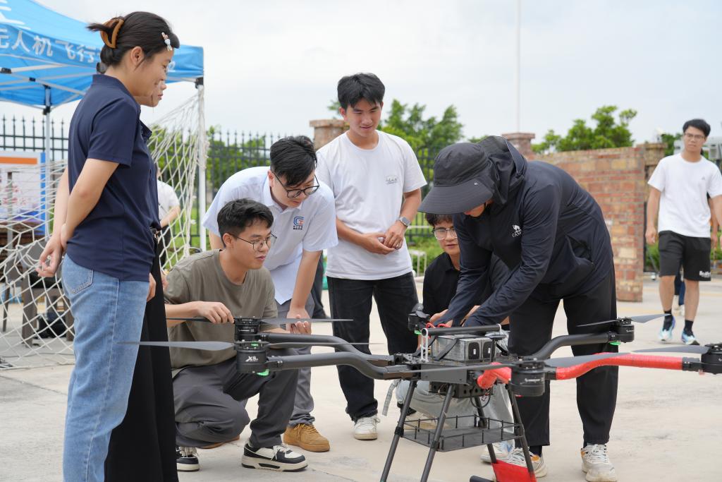 在廣西(玉林)技能人才服務產業園,一架無人機旁圍滿了學員,大家聽著教練講解,討論交流聲此起彼伏?!暗涂战洕l展迅速,就業前景不錯?!睂W員周彪目前處于待業狀態,希望通過在園區的學習考取無人機駕駛執照。