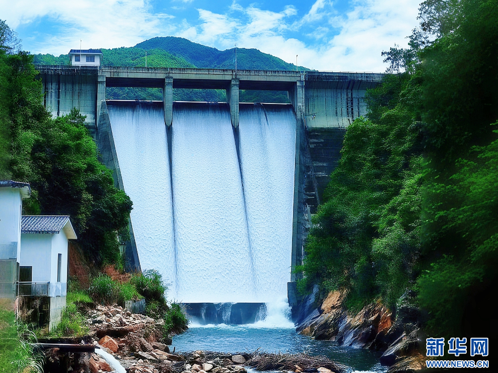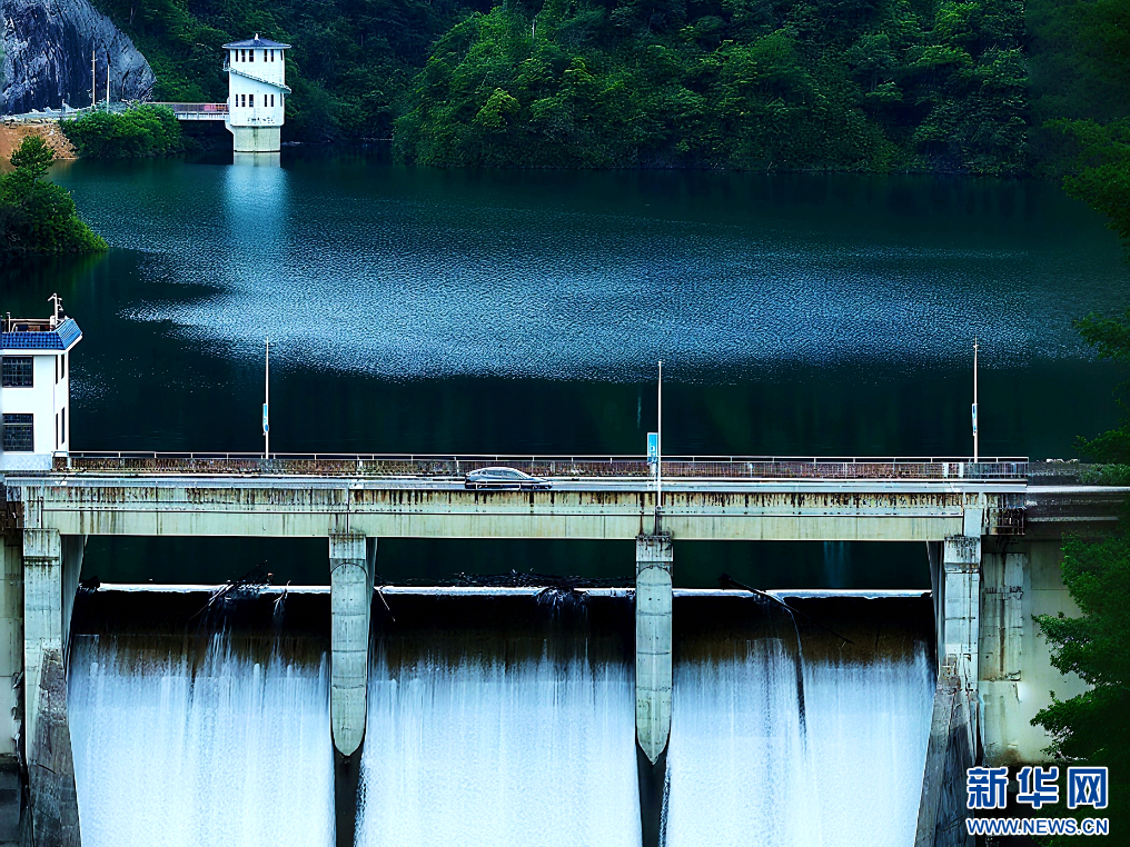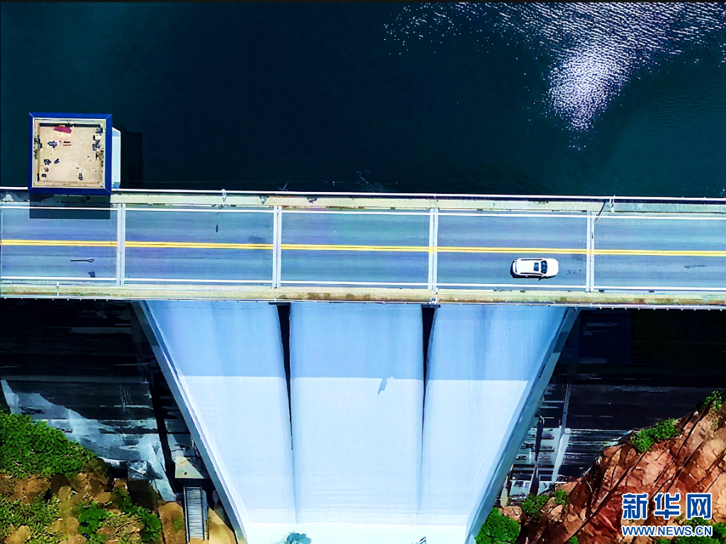 近日,在廣西賀州市路花水庫,車輛從“瀑布”上方“懸空”的大壩公路駛過,畫面美得令人心醉。(貝佳杭 黎學武)
