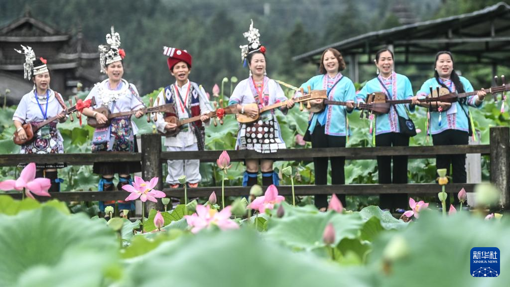 6月28日,在廣西三江侗族自治縣良口鄉和里村的荷花池,村民彈著侗族琵琶歌唱。