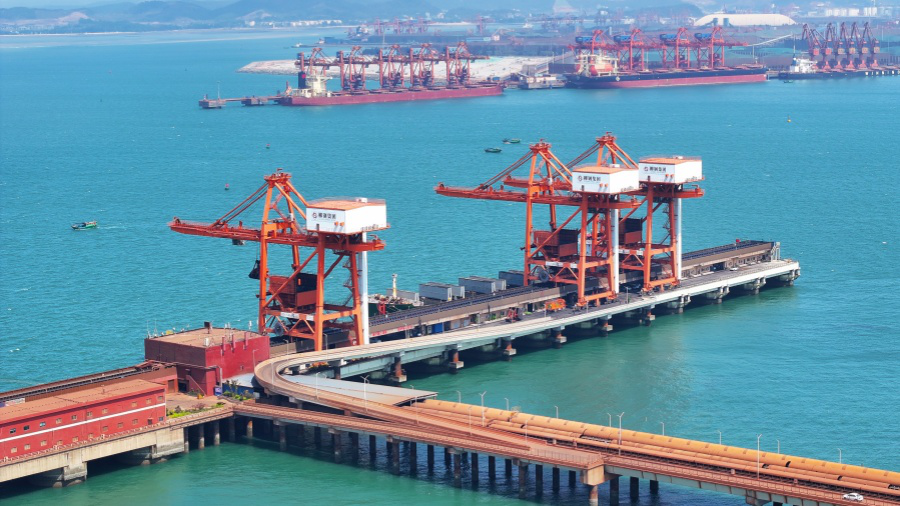 廣西鋼鐵集團(柳鋼防城港基地)原料碼頭港機列陣而立,在海天間奏響繁忙旋律。