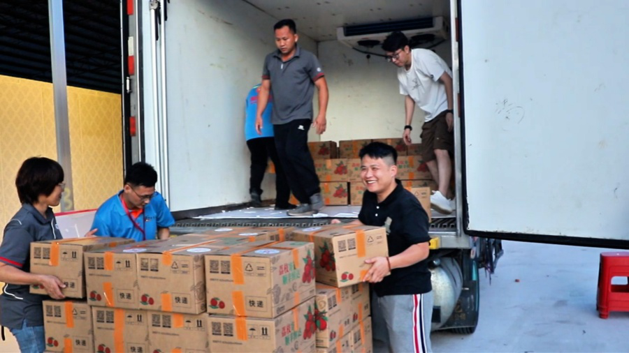 近日,廣西貴港桂平市麻垌荔枝品牌聯合體集配中心一派繁忙景象,工人們正忙著分揀、打包一顆顆紅艷飽滿的荔枝。這批麻垌荔枝即將搭乘冷鏈車,跨越1600公里,直抵河南萬邦國際交易市場。