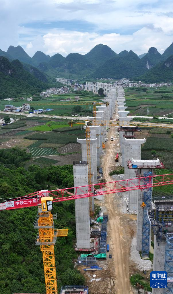 7月1日,中鐵二十局的工人在柳州市柳江區三都鎮魚宜高速公路建設工地作業(無人機照片)。