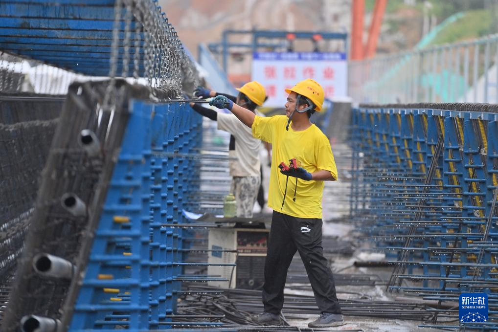 7月1日,中鐵二十局的工人在柳州市柳江區三都鎮魚宜高速公路建設工地作業。