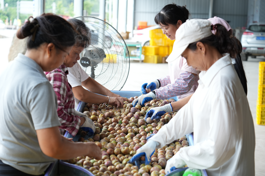 冷庫門前工人在挑揀三華李 譚小榮 攝