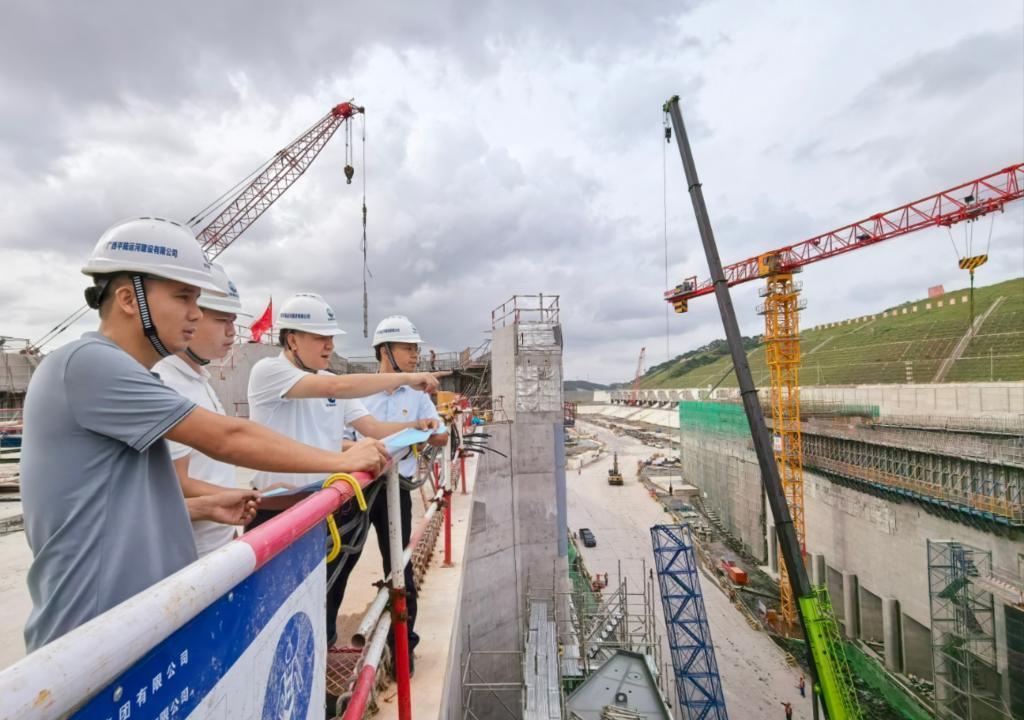 在廣西平陸運河青年樞紐,潘劍(右二)和團隊成員正在巡查施工現場。新華社記者 楊馳 攝