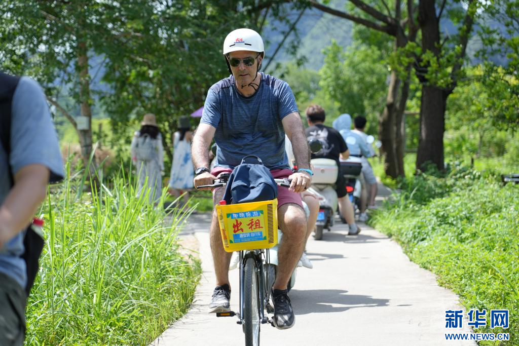 7月3日,在廣西桂林市陽朔縣,外國游客在騎自行車游覽。新華社記者 張楓 攝