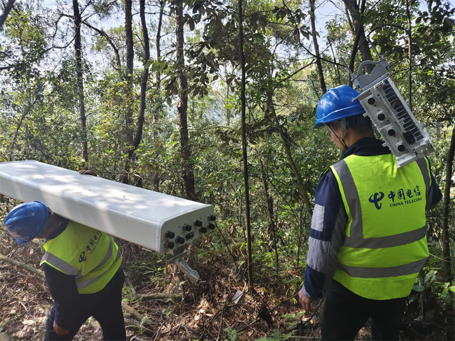 設備施工人員正在搬運基站設備。黎宇杰 攝