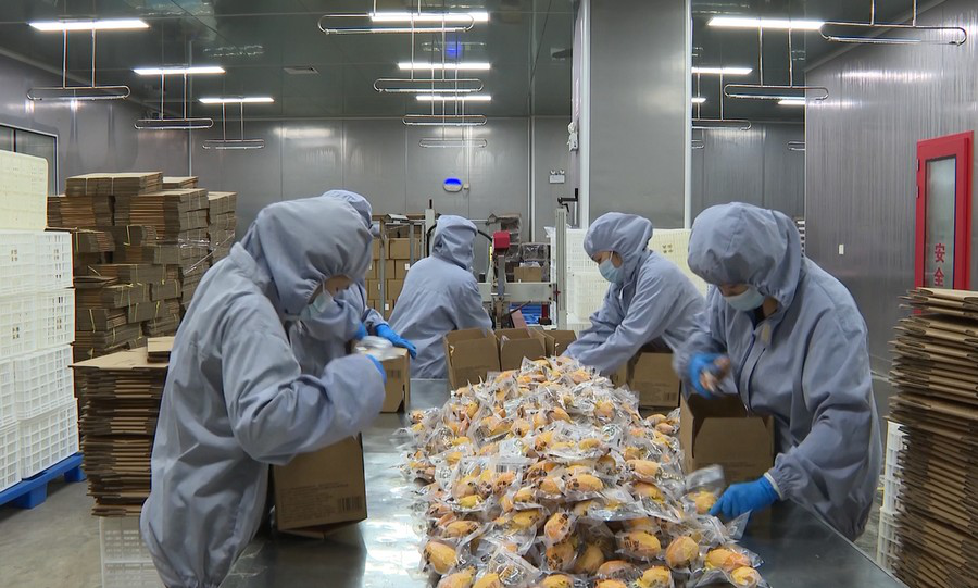 在憑祥產業園區的廣西中果實業有限公司生產車間,工人們進行芒果削皮、包裝等加工作業。目前,該公司已承接冷凍果肉、果汁果漿等加工訂單約1800噸,并與多家知名食品飲料企業及新茶飲品牌達成合作意向。