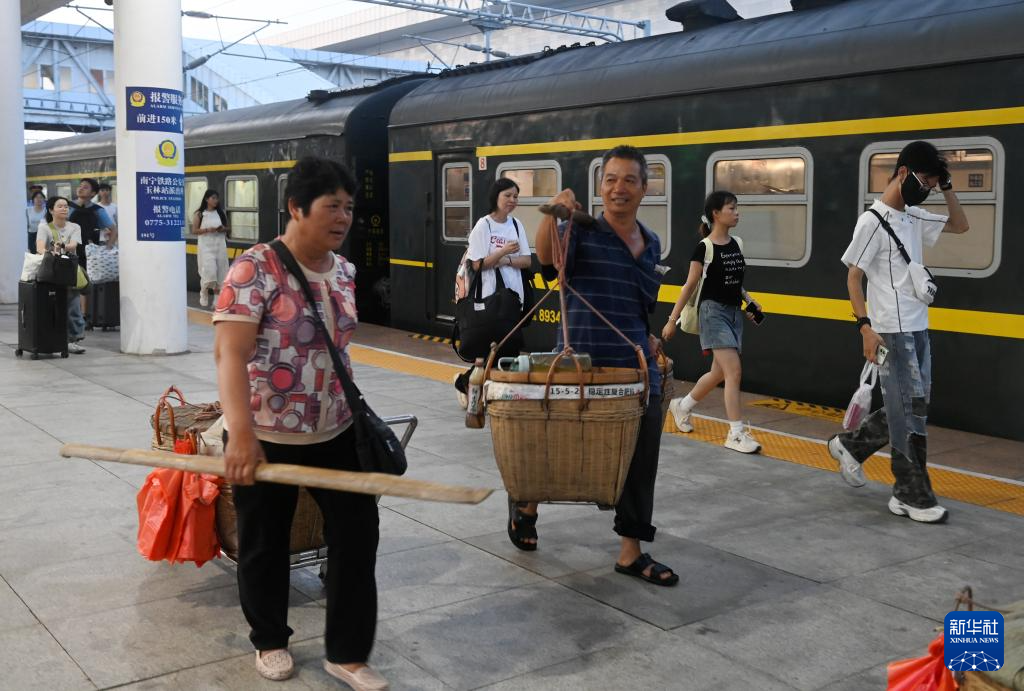 7月9日,在黎湛鐵路玉林站,一名賣完水果的果農(前左一)準備乘坐火車回家。
