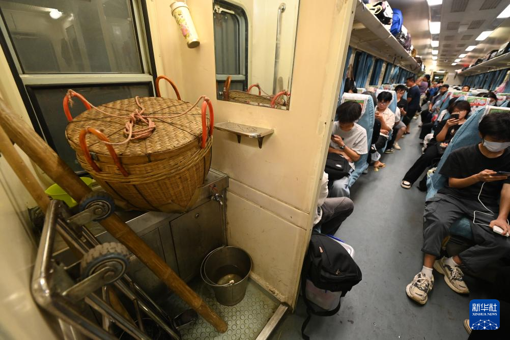 7月9日,在廣西南寧市開往廣東湛江市的綠皮火車上,果農將扁擔、籮筐和拖車等工具放置在車上。