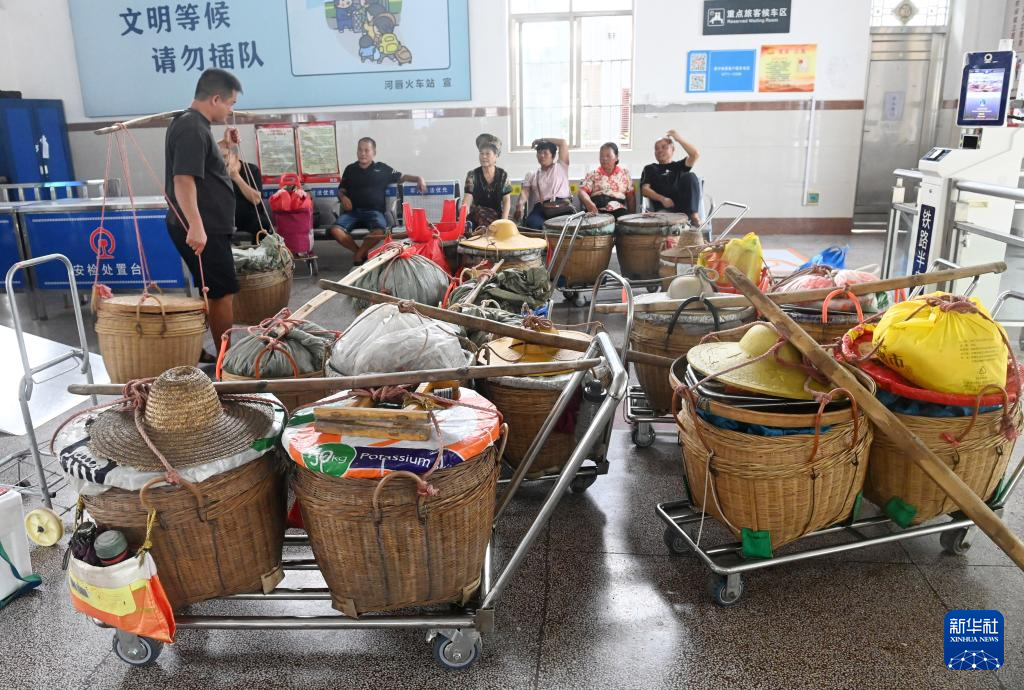 7月10日,在黎湛鐵路河唇站,果農將裝有水果的籮筐擺放在候車廳等待檢票出行。