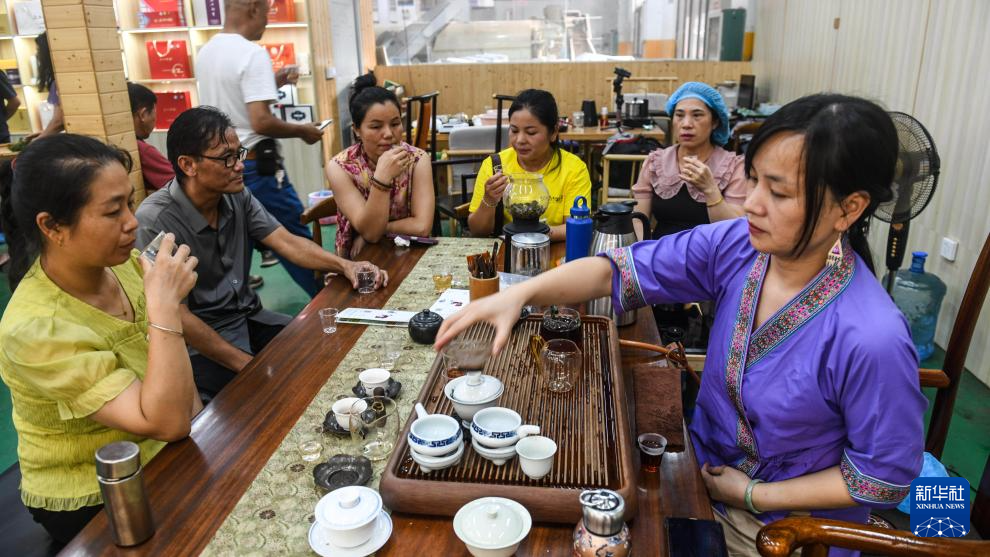 7月11日,制茶匠人在廣西三江縣御香茶業有限公司品評六堡茶。