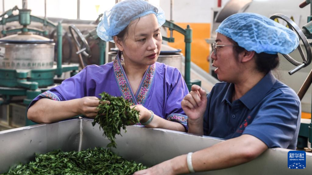 7月11日,兩名制茶匠人在廣西三江縣御香茶業有限公司生產車間交流制茶心得。