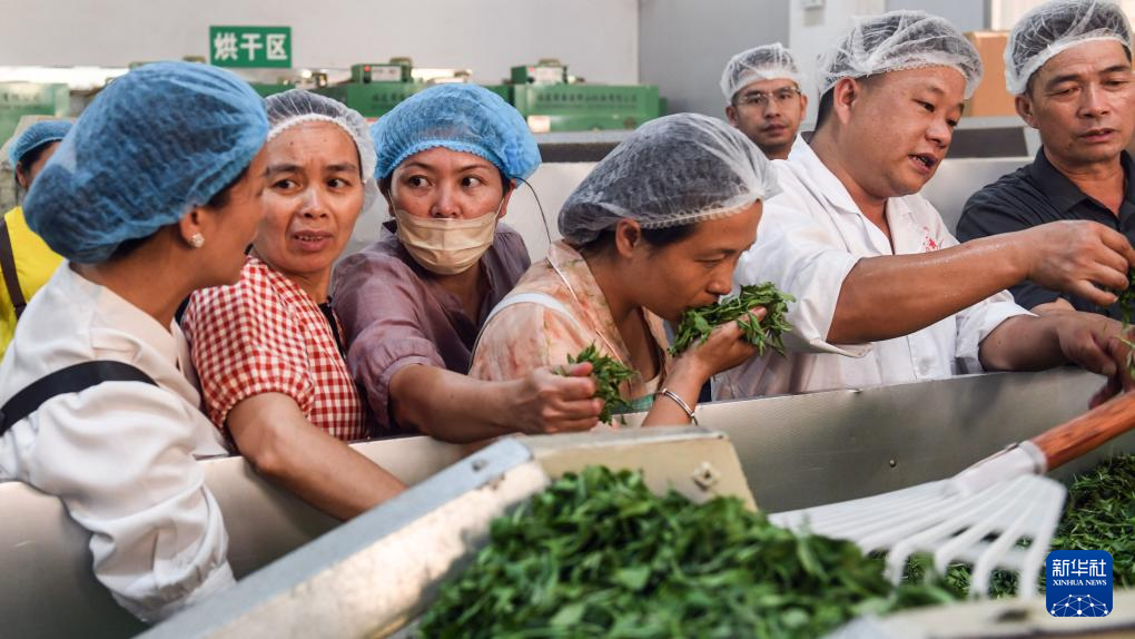 7月11日,制茶匠人在廣西三江縣御香茶業有限公司生產車間學習比對茶葉“殺青”技藝。