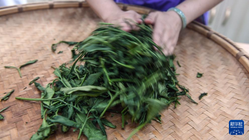 7月11日,制茶匠人在廣西三江縣御香茶業有限公司生產車間演示茶葉“揉捻”技藝。