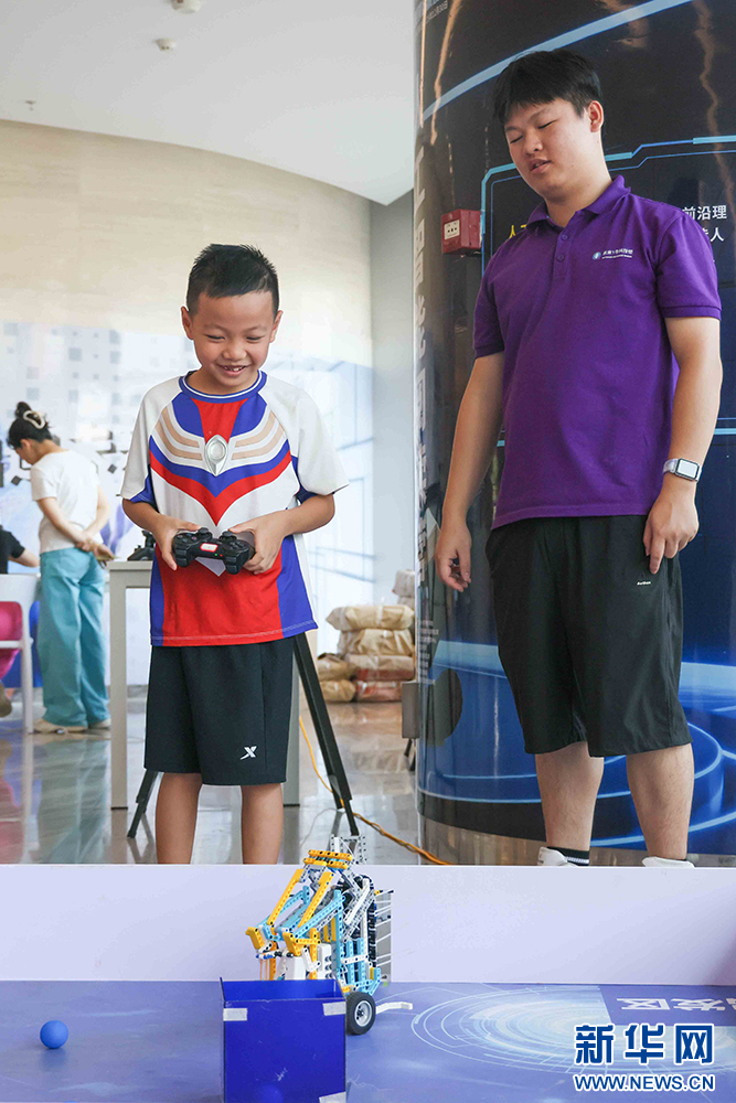 在南寧市良慶區青少年人工智能創意體現營活動現場,學生參加機器人“芯“靈手巧——機械工程對抗賽。陳子婧 攝