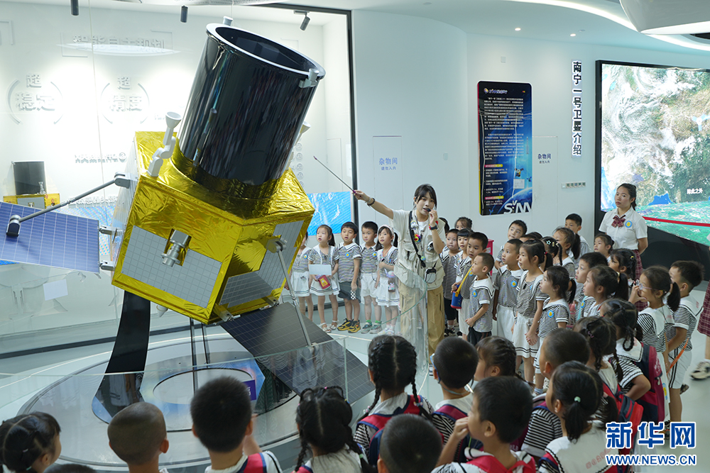 在南寧市良慶區星耀南寧科學館,學生在聽講解員介紹廣西第一顆衛星。