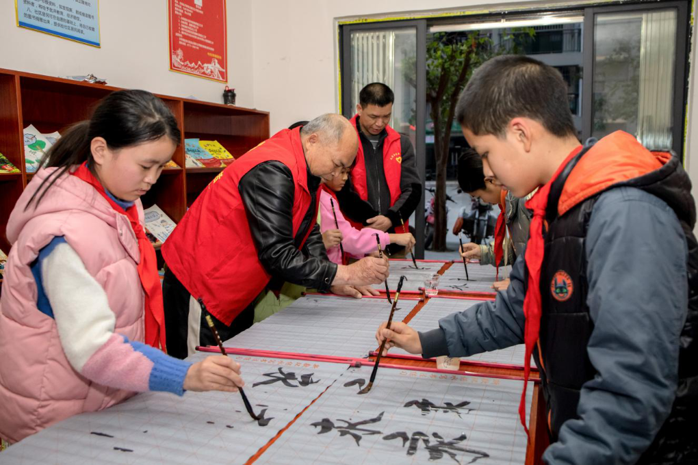 志愿者在龍巖社區的學童托管站教孩子們寫毛筆字。黃麗華 攝