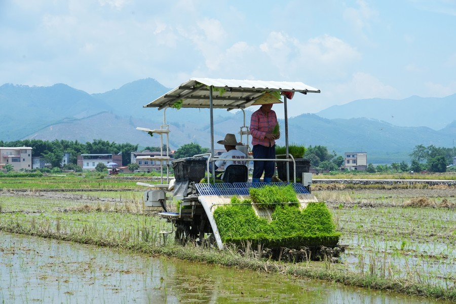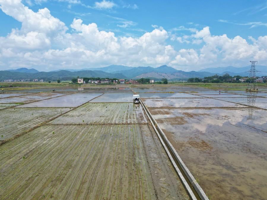 近日,位于賀州市八步區鋪門鎮的廣西2025年水稻高產攻關示范片千畝基地,數臺現代化插秧機開足馬力,在水田中穿梭,所過之處,一行行翠綠的秧苗整齊“立正”,迅速鋪滿水田。這片采用全程機械化作業的示范基地,通過科技賦能顯著提升“雙搶”時節作業效率,為晚稻的豐產打下堅實基礎。