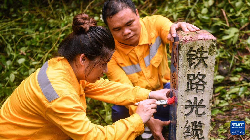 這是欽州電務段兩名鐵路通信工在對區間直放站光纜徑路標樁進行涂油描字(8月6日攝)。