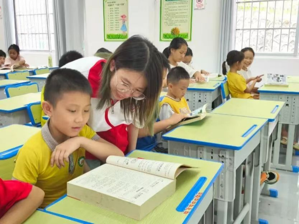 在天等縣龍巖社區,共青團天等縣委組織開展“七彩假期 鄉村兒童守護陪伴營”志愿服務活動,返鄉大學生志愿者為孩子們上閱讀分享課。