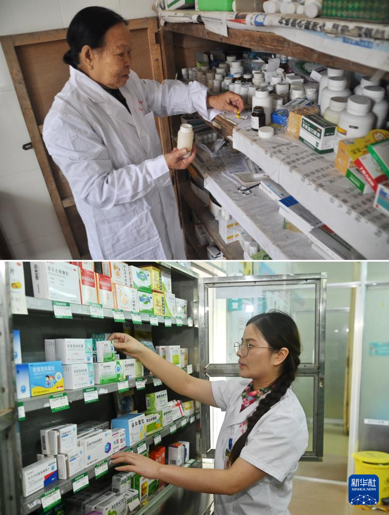 這是一張拼版照片。上圖:杜桂梅醫生在高嶺村衛生室為病人配藥(2011年12月7日攝)。下圖:潘雪梅醫生在高嶺村衛生室為病人找藥品(2025年8月18日攝)。