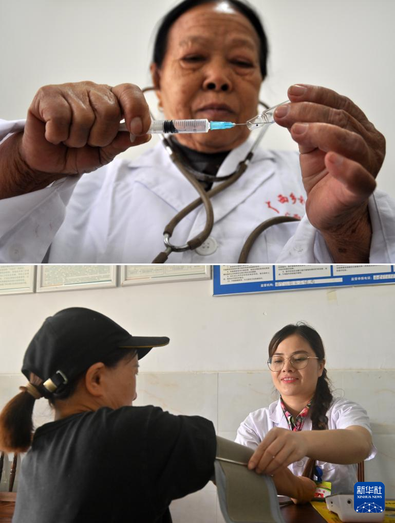 這是一張拼版照片。上圖:杜桂梅醫生在高嶺村衛生室給村民打針(2011年12月7日攝)。下圖:潘雪梅醫生在高嶺村衛生室為村民把脈看?。?025年8月18日攝)。