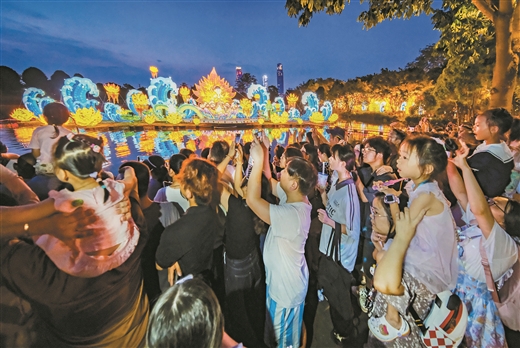 游客在南寧夜花園里觀賞哪吒主題情景演繹秀水上燈展。 廣西云-廣西日報記者周軍/攝