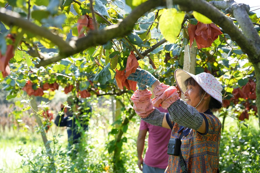 村民正在采摘獼猴桃。勞婉靜 攝