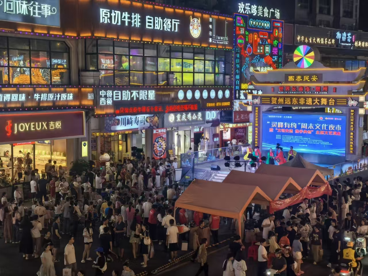 傍晚時分,暑氣逐漸散去,市民們聚在商圈里的舞臺前,不多時,一場文藝演出拉開了序幕。由文藝愛好者帶來《京腔戲韻》表演,“常青藝術團”呈現國潮戲曲《梨園春》,八步龍山小學學生表演原創作品《圓夢蒲公英》……這是每周末晚,在賀州市城區遠東商圈內舉行“靈峰有約”周末文化夜市活動的一個縮影。