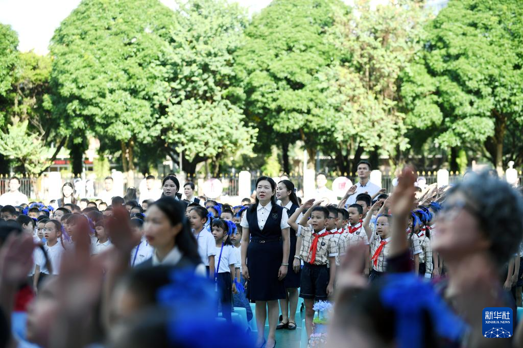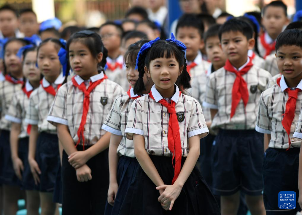 9月1日,在廣西南寧市濱湖路小學,學校師生在開學典禮升國旗儀式上向國旗行注目禮。新華社記者 陸波岸 攝