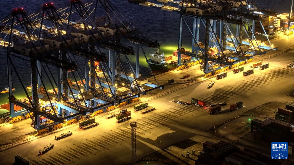 正在進行晚間作業的欽州港碼頭(9月4日攝,無人機照片)。