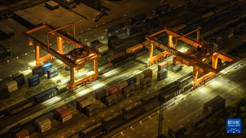 欽州鐵路集裝箱中心站塔吊在為貨列裝運集裝箱(9月4日攝,無人機照片)。