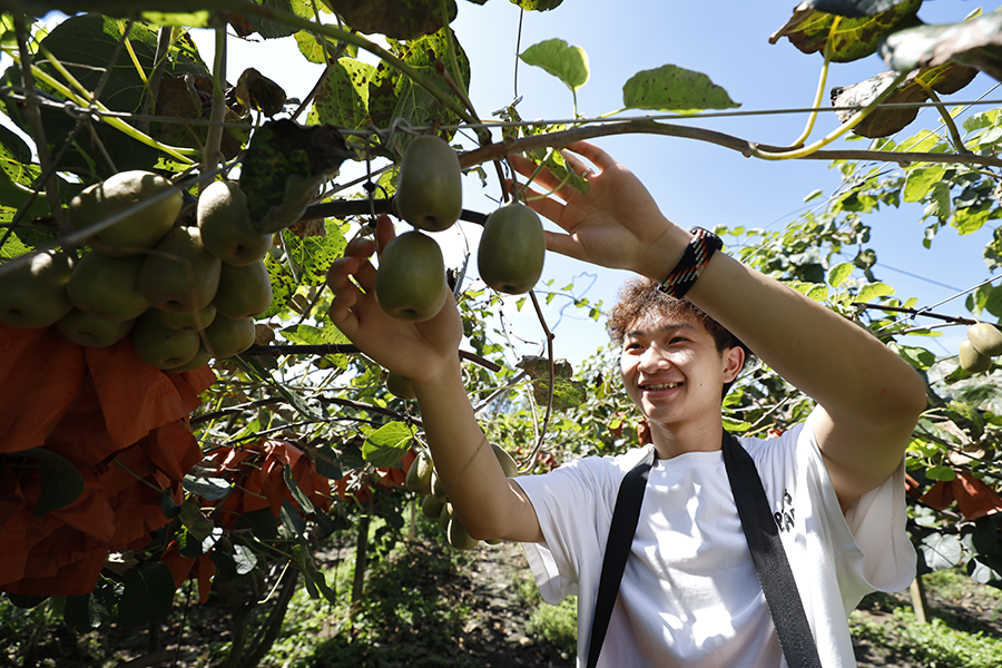 大批獼猴桃即將成熟,農戶正在為果子摘套。